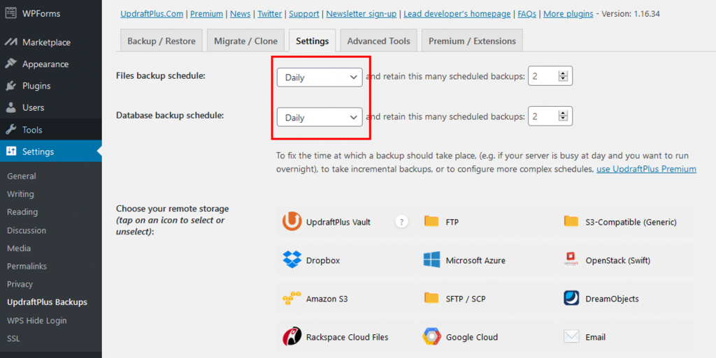 First, navigate to the settings portion of the dashboard and select UpdraftPlus Backups.  Then, click the settings tab and set the Files backup schedule and the Database Backup schedule to “Daily”.