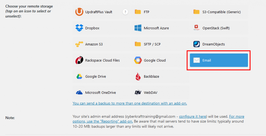 By default, Updraft will send these backups to the e-mail address of the administrator account of the WordPress site.  Updraft can also be configured to send backups to cloud storage, like Google Drive, but this feature is only available with the premium version of Updraft.