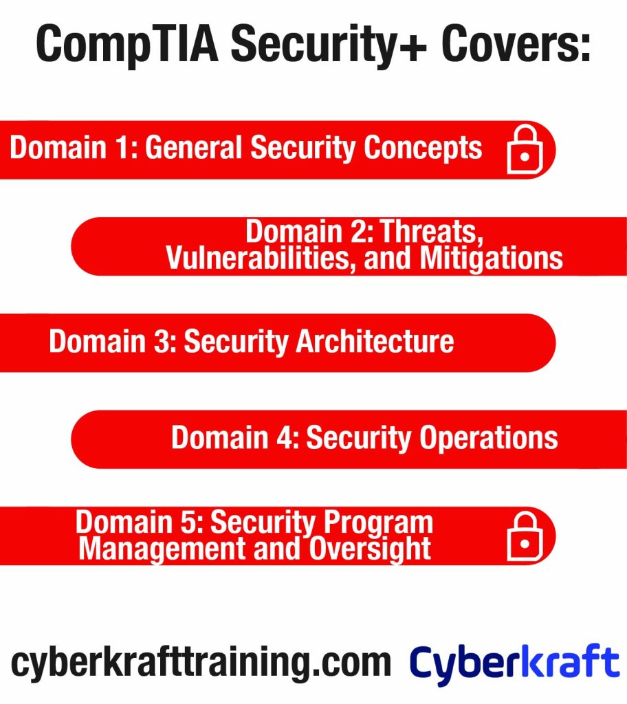 The CompTIA Security+ (SY0-701) exam covers:
