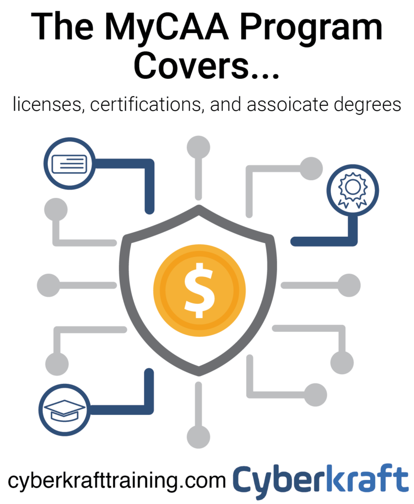MyCAA covers industry-recognized postsecondary credentials that lead to portable careers. All of the Cyberkraft cybersecurity certifications listed above are MyCAA-approved. You’ll be able to earn one certification per year.